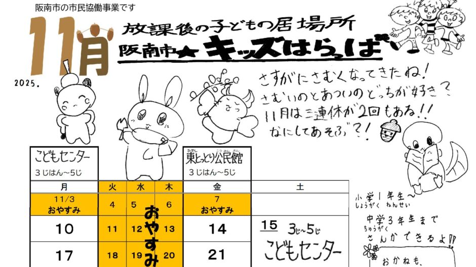 「阪南市☆キッズはらっぱカレンダー」の最新号をお届けします。小中学生の放課後の居場所「キッズはらっぱ」の開催日や、対象年齢向けのイベントをご案内しています。