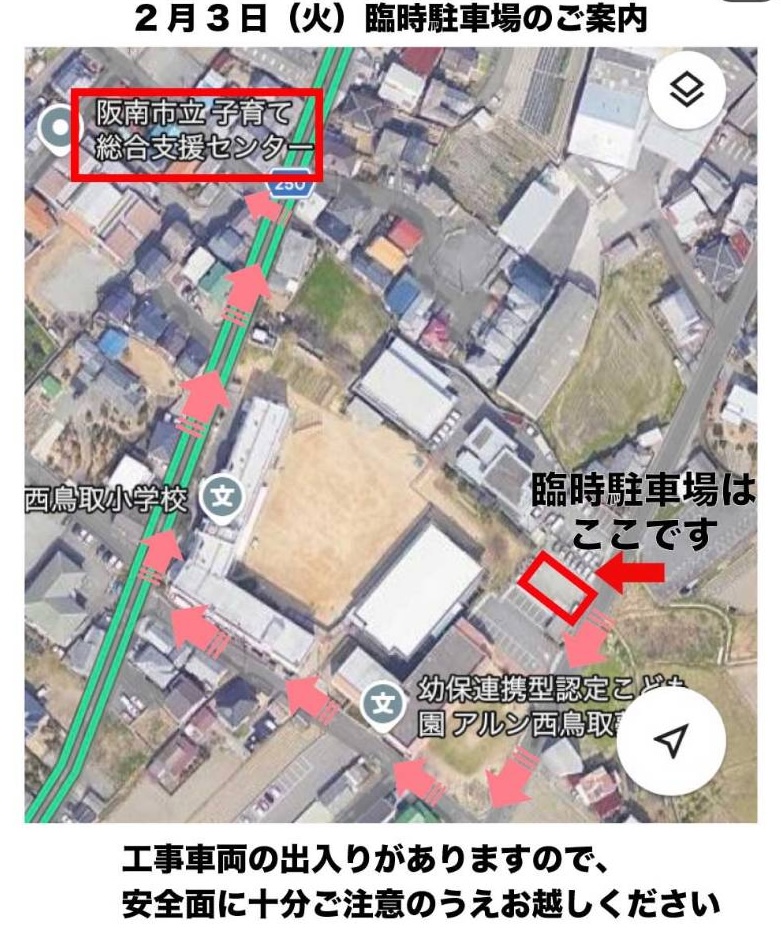 【お知らせ】2/3(火)子育て総合支援センター:下水道工事による臨時駐車場のご案内
