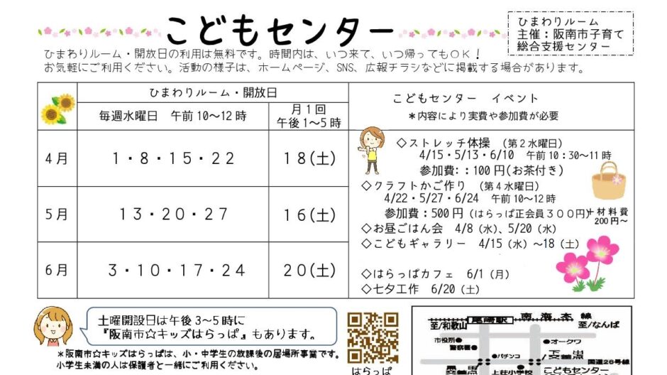 また昨年4月より、こどもセンター開放日の一部を阪南市の「地域子育て支援拠点事業 ”ひまわりルーム”」として開放しています。「いつ来ても、いつ帰ってもいい、おやこの居場所」としてご利用ください。