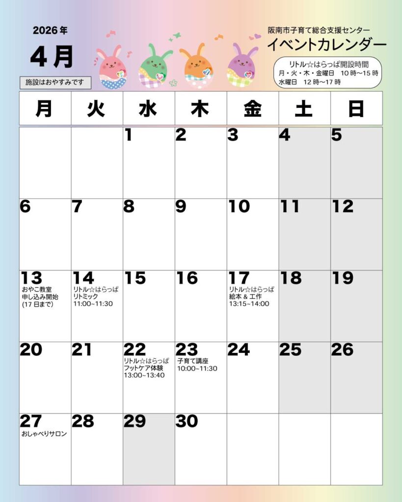 申し込み・問い合わせは子育て総合支援センター(電話:072-479-6510)までお願いいたします。