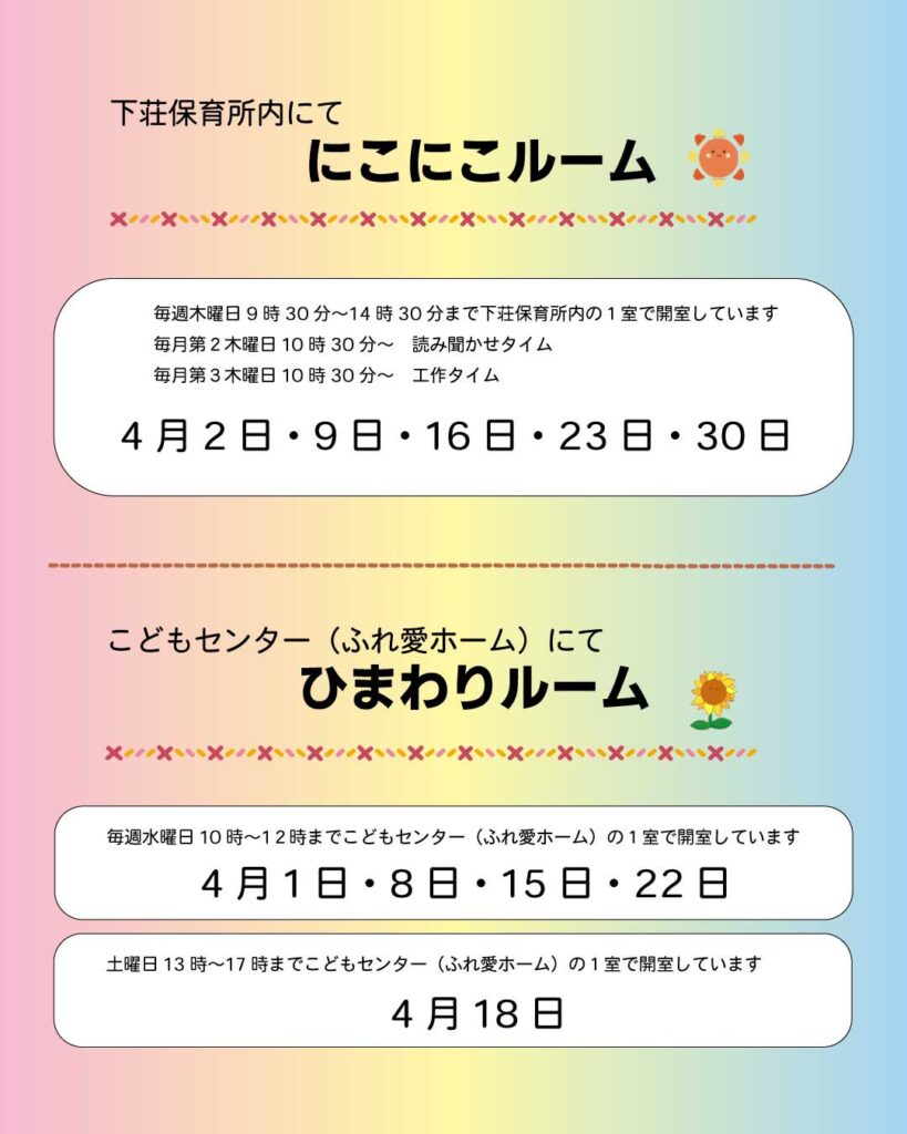 4月から、こどもセンター(ふれ愛ホーム)内一部スペースで、おやこでゆったりあそべる「ひまわりルーム」を開室しています。